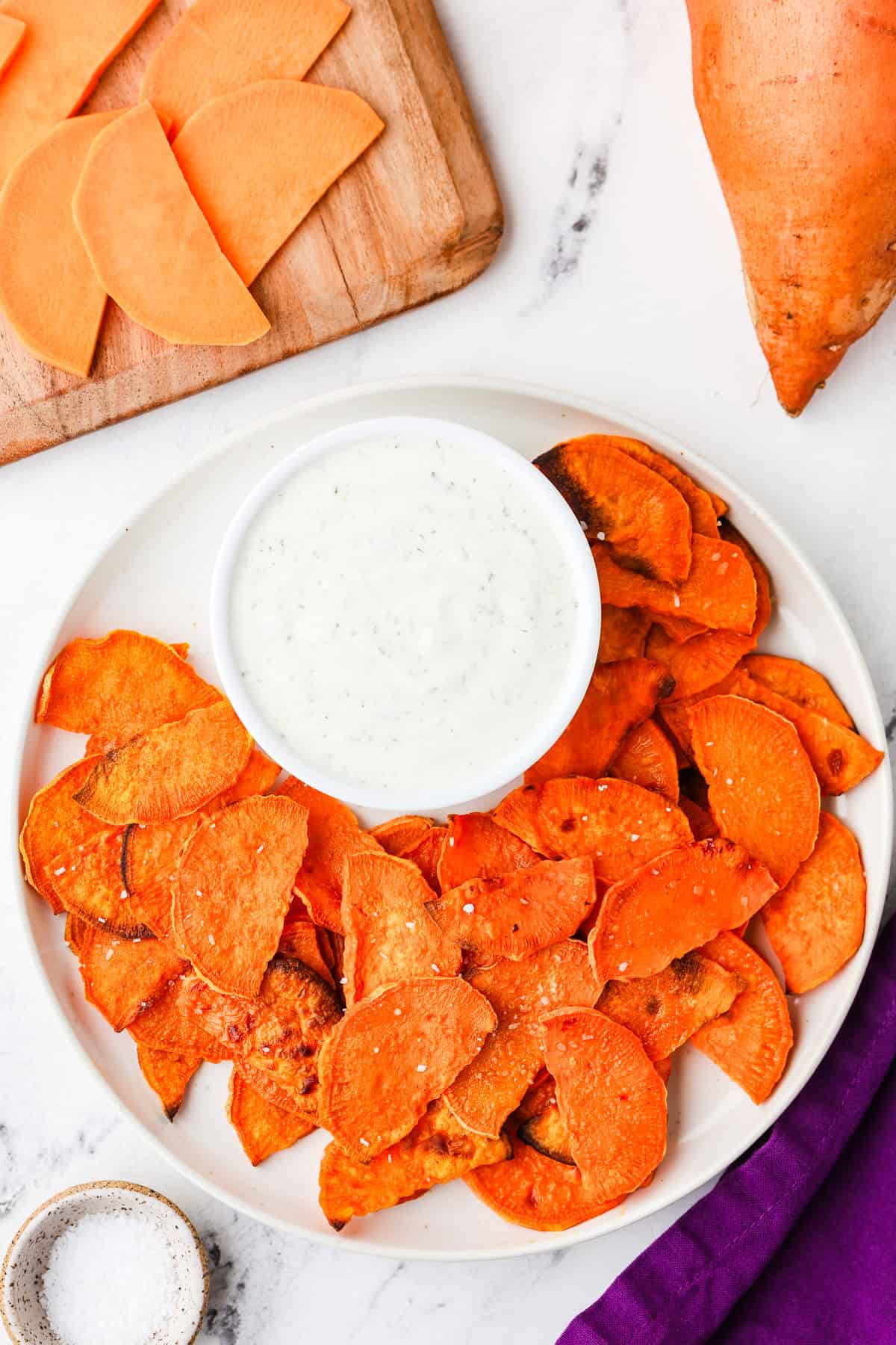 - Sweet potatoes caramelize beautifully in the oven which gives each chip a sweet and salty balance.