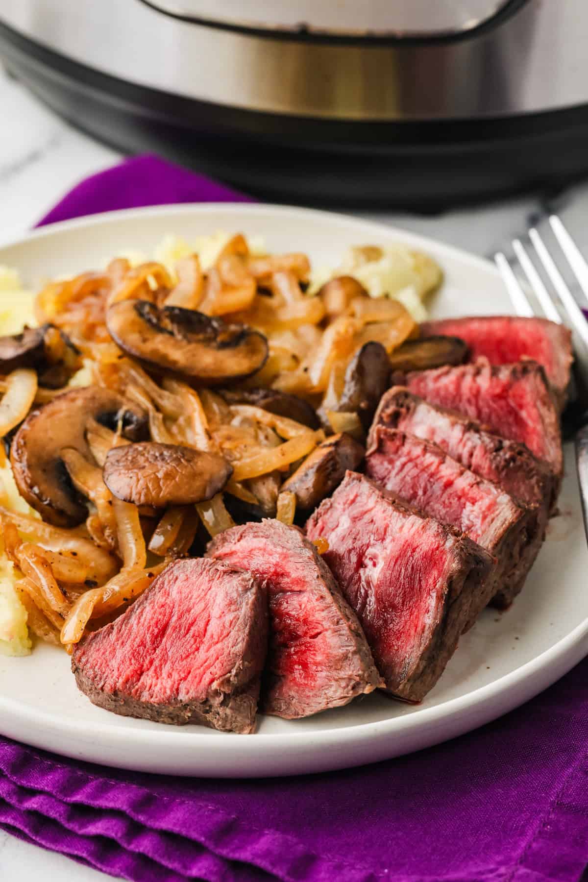 - Optional sear (to cook further or give it a sear):Drain liquid, turn on Sauté, add a bit of butter or oil, and sear steaks for 1-2 minutes per side for a golden crust.Top steaks with the buttery mushrooms and onions (optional). Season with salt, pepper, and any preferred steak seasoning. Serve immediately.